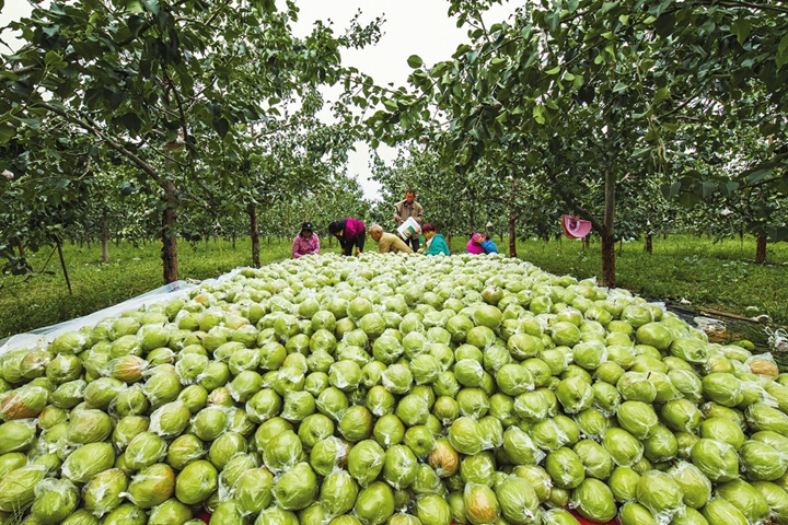 隰县玉露香梨栽植面积和产量居全国首位,优质果品俏销全国。图为村民们在收获果实。