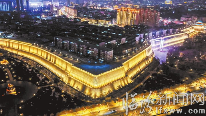 夜幕降临,临汾古城墙在灯带的映衬下,流光溢彩,如梦如幻。记者 闫锐鹏 摄