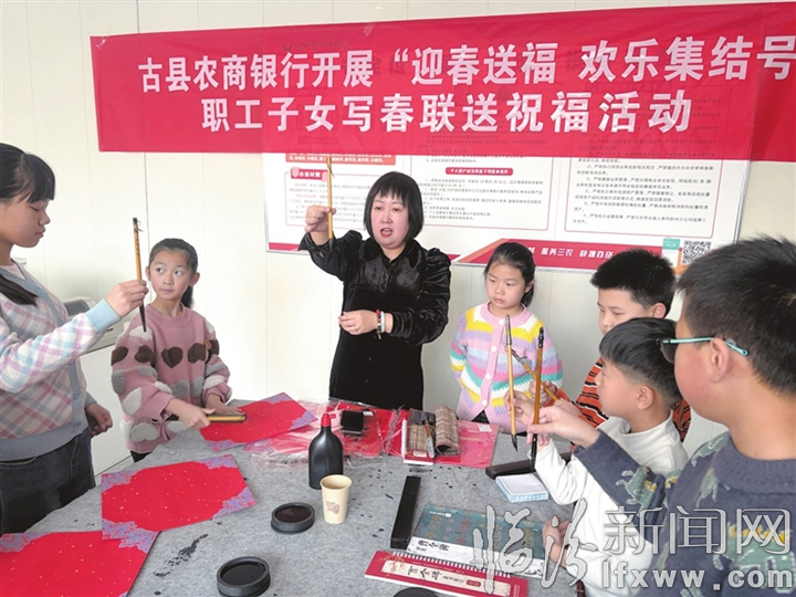 临汾新闻网讯 近日,古县农商银行开展职工子女写春联送祝福活动,让孩子们在笔墨书香中感受年俗魅力,弘扬中华优秀传统文化,在欢声笑语中传递新春美好祝福。图为书法老师为孩子们授课。