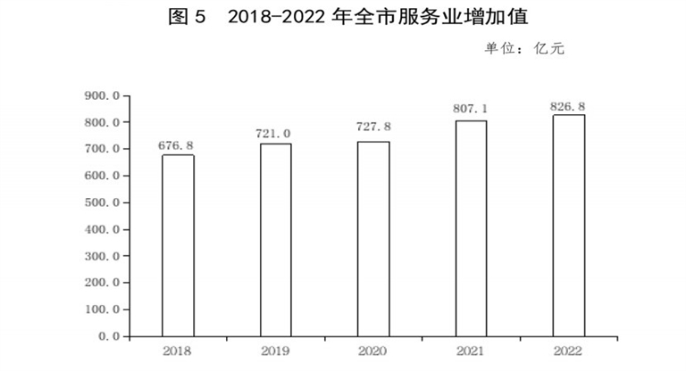 全年全市服务业增加值826.8亿元,按不变价格计算,比上年增长3.4%。其中,批发和零售业增加值136.5亿元,增长1.8%;交通运输、仓储和邮政业增加值98.5亿元,下降2.0%;住宿和餐饮业增加值17.8亿元,增长3.6%;金融业增加值92.1亿元,增长6.5%;房地产业增加值98.4亿元,下降4.7%;营利性服务业增加值98.1亿元,增长5.7%;非营利性服务业277.2亿元,增长7.3%。全年规模以上服务业企业营业收入下降0.3%。