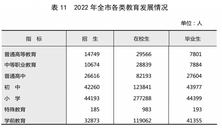 年末全市高等院校4所。全年新(改、扩)建公办幼儿园10所,认定普惠性民办幼儿园34所,学前教育毛入园率达到98.3%。