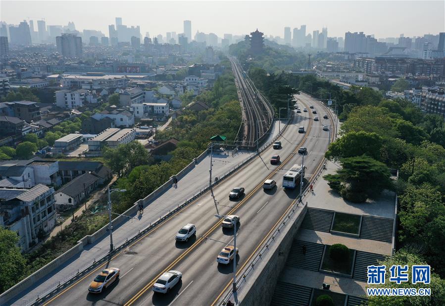 4月15日在早高峰时段拍摄的武汉长江大桥(无人机照片)。 新华社记者 李贺 摄