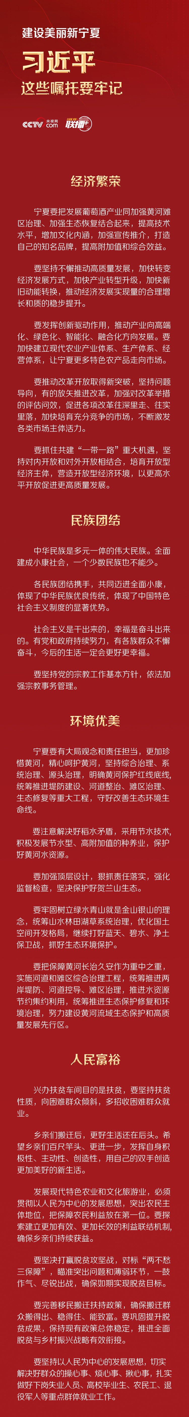 联播+ “要全面落实党中央决策部署,坚持稳中求进工作总基调,坚持新发展理念,落实全国‘两会’工作部署,坚决打好三大攻坚战,扎实做好‘六稳’工作,全面落实‘六保’任务,努力克服新冠肺炎疫情带来的不利影响,优先稳就业保民生,决胜全面建成小康社会,决战脱贫攻坚,继续建设经济繁荣、民族团结、环境优美、人民富裕的美丽新宁夏。”