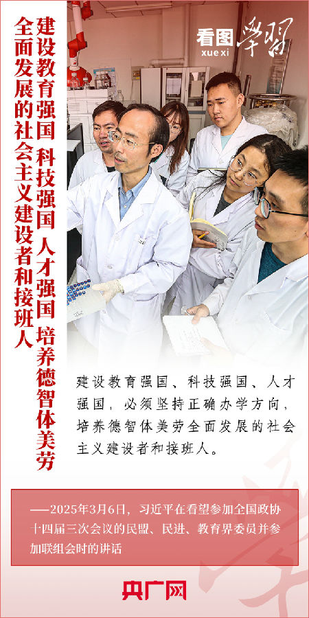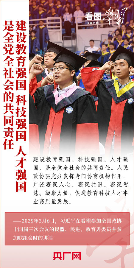 “建设教育强国、科技强国、人才强国,是全党全社会的共同责任。”3月6日,习近平总书记在看望参加全国政协十四届三次会议的民盟、民进、教育界委员并参加联组会时发表重要讲话。总书记就做好教育、科技、人才工作作出深刻阐释,强调必须深刻把握中国式现代化对教育、科技、人才的需求,强化教育对科技和人才的支撑作用,进一步形成人才辈出、人尽其才、才尽其用的生动局面。一起来学习!