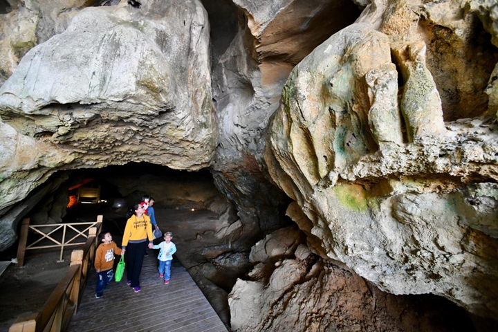 游客在万寿岩遗址船帆洞内游览。
