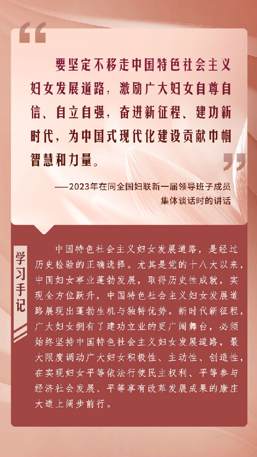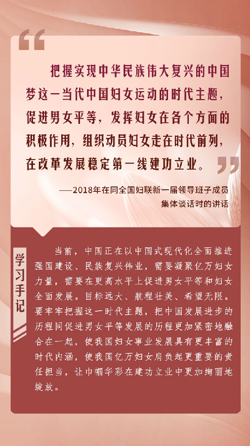 党的十八大以来,习近平总书记关心关怀妇女全面发展、谋划部署推进妇女工作,激励亿万妇女在实现中华民族伟大复兴的新征程上昂首向前、奋斗逐梦,也为加快实现性别平等、促进全球妇女事业发展指引方向。