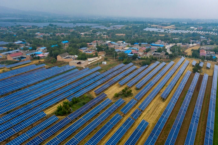 2025年6月25日在山西省运城市芮城县夭上村拍摄的光伏基地(无人机照片)。新华社记者 杨晨光 摄