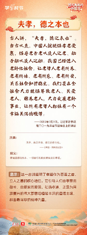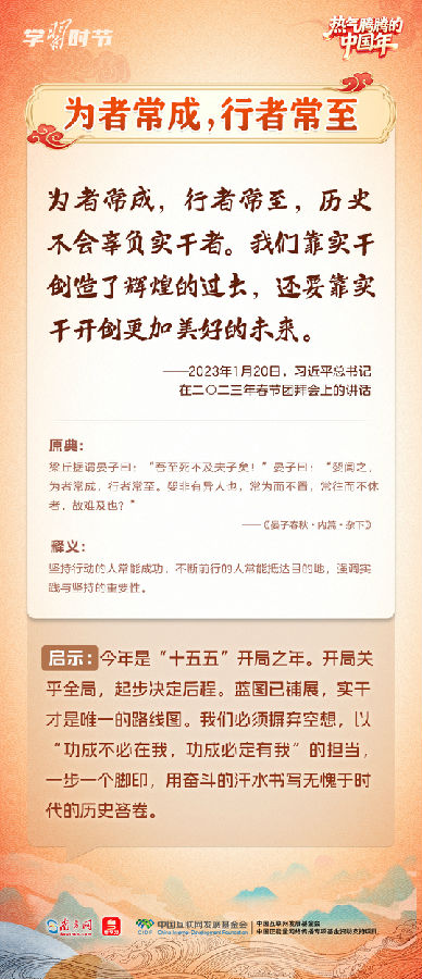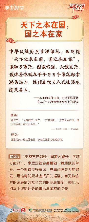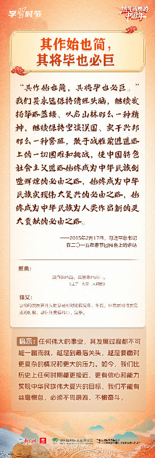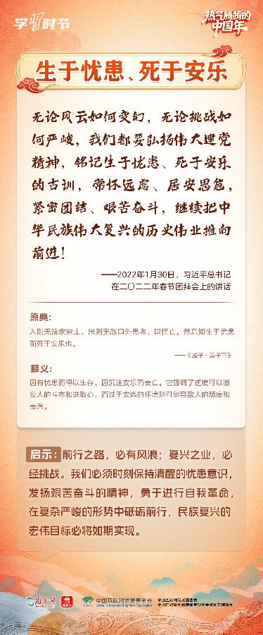 “在中国式现代化新征程上策马扬鞭、勇往直前,共同开创更加美好的未来。”2月14日,在二〇二六年春节团拜会上,习近平总书记的重要讲话振奋人心。党的十八大以来,习近平总书记多次在春节团拜会上发表重要讲话,回望旧岁、展望新年,向大家致以美好的新春祝福。在讲话中,习近平总书记常常巧妙引用古典名句砥砺人心,指引我们脚踏实地、锐意前行,提醒我们珍视亲情、涵养孝道。一起来学习感悟。
