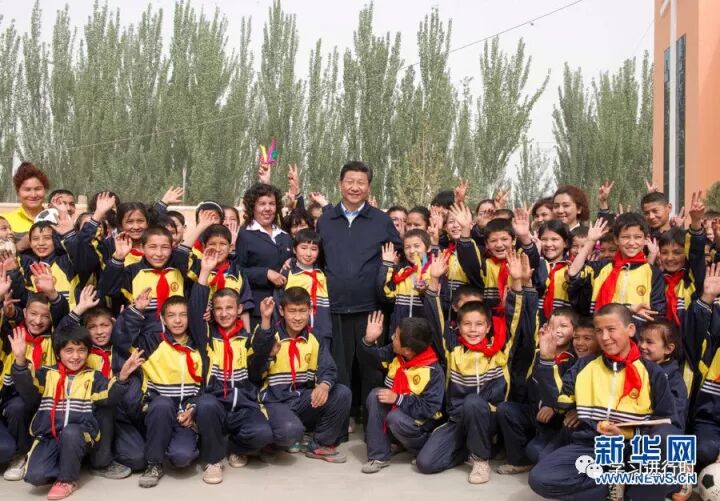 2014年4月28日,习近平在新疆疏附县托克扎克镇中心小学同师生们合影。