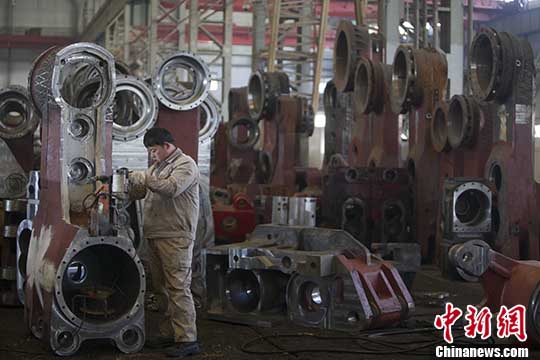 资料图:山西太重工人正在检测机械配件。 中新社记者 张云 摄