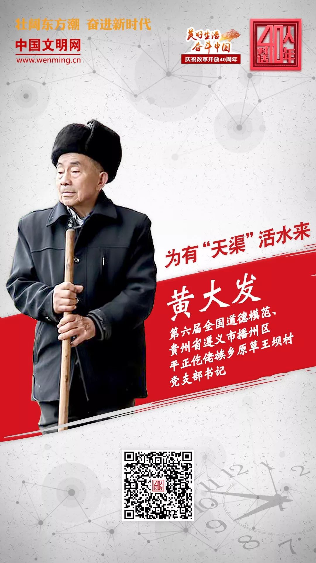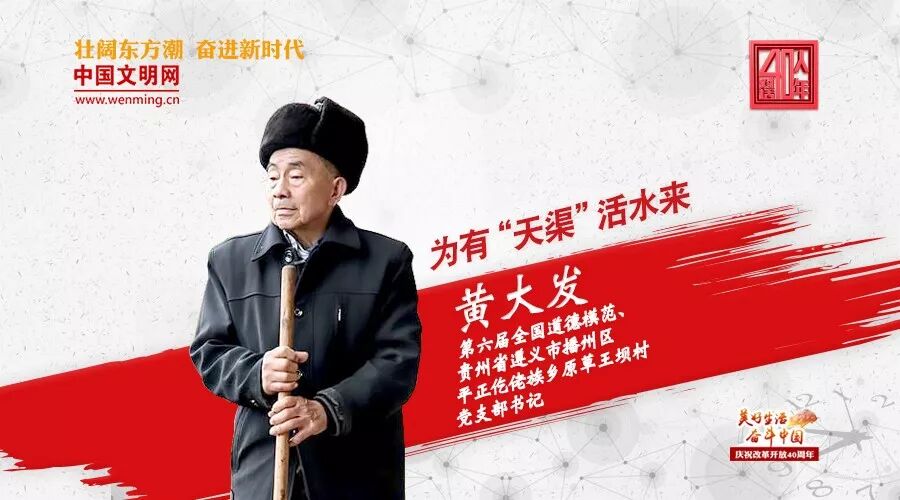 黄大发,1959年11月加入中国共产党,贵州省遵义市播州区平正仡佬族乡原草王坝村党支部书记。20世纪60年代起,他带领群众,历时30余年,靠着锄头、钢钎、铁锤和双手,在绝壁上凿出一条长9400米,地跨3个村的“生命渠”,结束潦草王坝长期缺水的历史,乡亲们亲切地把这条渠称为“大发渠”。2017年4月25日,中宣传部授予黄大发“时代楷模”荣誉称号;2017年11月,黄大发荣获第六届全国诚实守信模范。