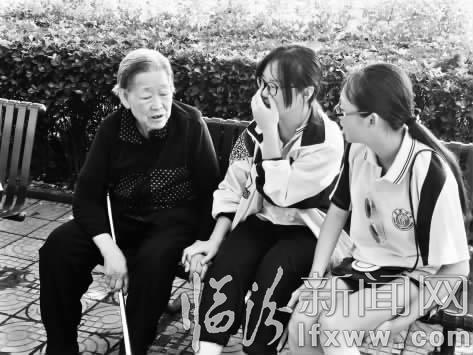右图:两位女同学和老奶奶拉家常。(李培华)