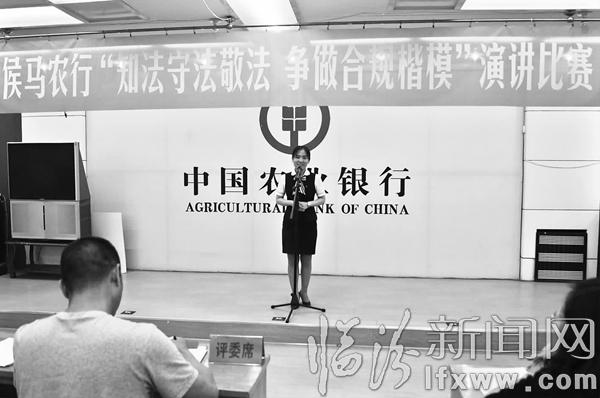 临汾新闻网讯 日前,农行侯马市支行员工正在参加“知法守法敬法争做合规楷模”演讲比赛。近期,该支行通过行长授课、知识竞赛、笔记展评、演讲比赛等多种形式推进“知法、守法、敬法”警示教育,筑牢员工拒腐防变思想防线。宋红权 摄