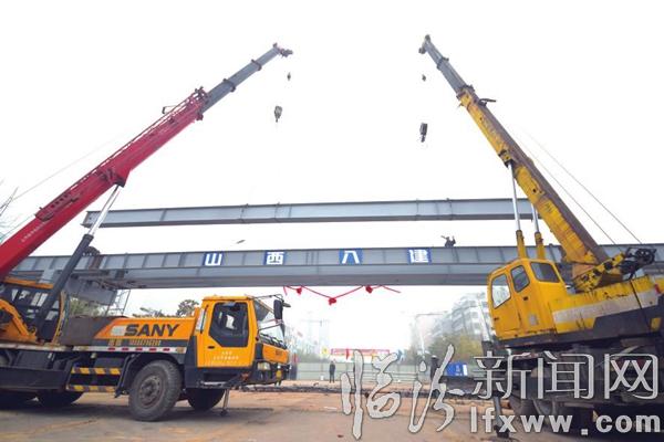 临汾新闻网讯 11月21日,霍州市鼓楼东街赵家庄小学人行天桥工程的五根横梁全部成功合龙。