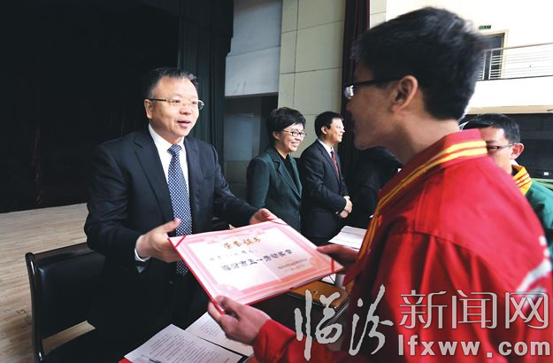 4月27日上午,我市召开“五一”暨“五小”竞赛优秀成果表彰大会,对一年来全市各行各业、各条战线上涌现出的先进集体和模范个人,以及2015年度、2016年度“五小”竞赛优秀成果进行表彰,动员全市广大职工以模范先进代表、优秀成果带头人为榜样,爱岗敬业、恪尽职守、无私奉献,为建设富裕文明绿色幸福新临汾再立新功。图为市领导为获奖者颁奖。 记者 魏华 摄