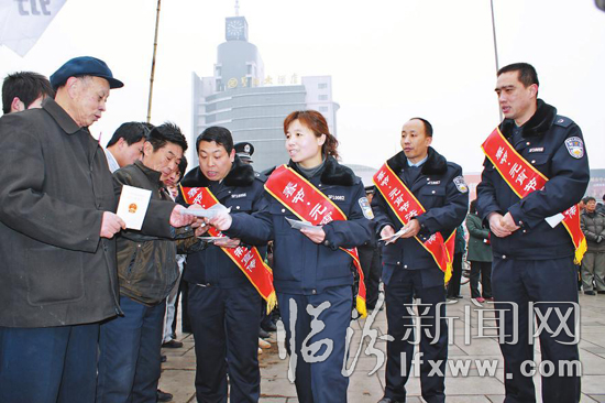 图为尧都区司法局工作人员走上街头为群众发放宣传资料