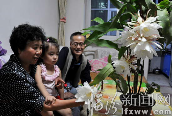 “这是今年第三次开花,前两次是农历五月十五、六月十五,这次稍迟了些,还是正好因为今天下了场阵雨,才开的快了。”贾阿姨告诉记者,晚上8点半左右她正在阳台上收拾家,发现昙花已经悄悄绽放开来,数了一下家里的3盆昙花开了足有12朵,最多的一盆还开了6朵,她自己也不敢相信,就叫来了邻居们一起看,没想到她们打电话给你了。说起养花的经历,贾阿姨和老伴相视后会心一笑,打开了话匣子。原来,她和老伴都非常喜欢养花,这三盆昙花已经养了20多年了,感情很深,平常都把它们当孩子一样精心呵护,定时定量浇水、施肥、除草一点都不含糊,上班工作忙的时候,两人轮班照料,从来没有间断过,正是这样的关爱有加,昙花才绽放的如此美丽,虽然只有短短几个小时,这也是对主人多年来的一种回报吧。