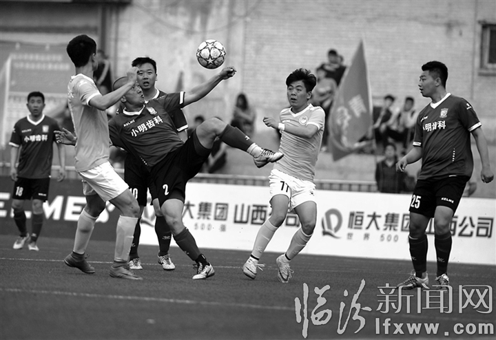 临汾新闻网讯 连日来,2018山西省足球协会超级联赛在市体育场开赛,来自全省13个足协杯冠军球队将在未来的4个月时间里通过13轮主客场单循环比赛,角逐2018赛季山西省足协联赛冠军。图为临汾尧王二队的球员在和朔州美乐队的球员进行球场角逐。
