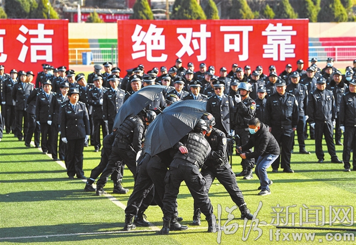 临汾新闻网讯 1月5日,市公安局直属分局在平阳中学操场开展迎首个“中国人民警察节”冬季练兵汇报演练活动,500余名干警现场展示了队列会操、擒敌拳、警务实战技能等科目内容。图为干警正在进行小单元作战演练。