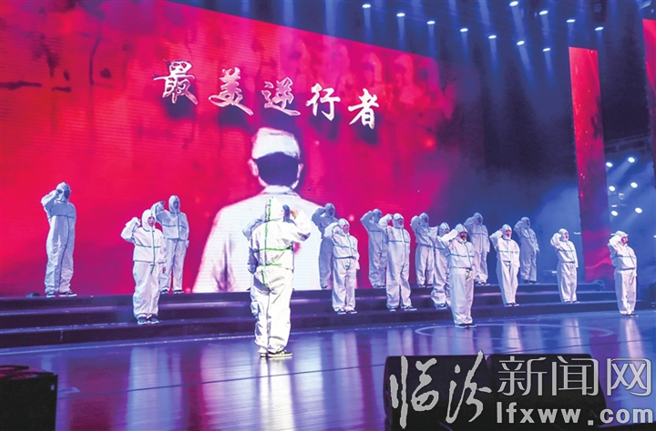 临汾新闻网讯 云霞开锦绣,万物启芳华。5月11日晚,在第109个国际护士节到来之际,我市举办了“致敬护士队伍,携手战胜疫情”为主题的庆祝晚会。多年来,全市护理工作者不忘初心、恪尽职守、无私奉献,肩负起了敬佑生命、救死扶伤的崇高使命,为我市卫生健康事业改革发展作出了积极贡献。图为情景再现支援湖北医疗队员宣誓现场。