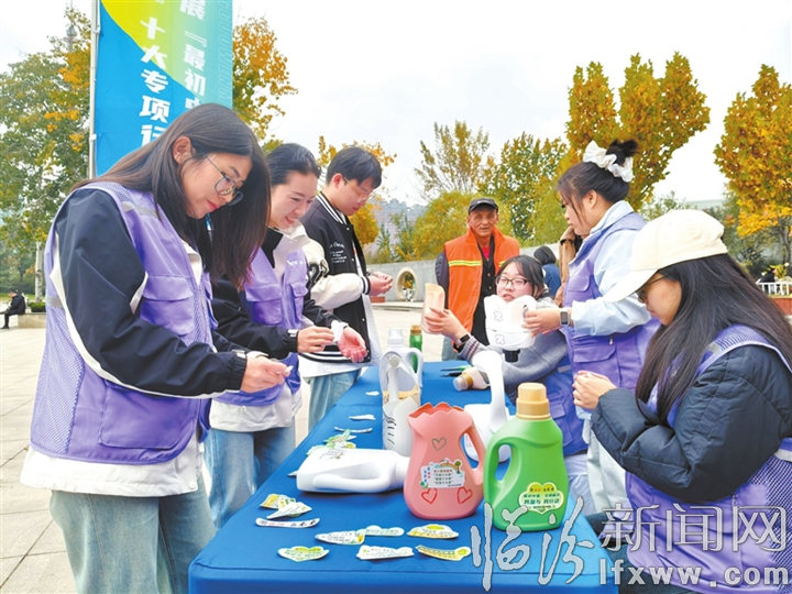临汾新闻网讯 日前,临汾市益启来社会工作服务中心组织志愿者来到市区廉政广场,通过现场展示“洗衣液瓶变花盆”的方式,让过往群众体验废物再利用的乐趣,营造绿色环保、创新向上的良好氛围。图为环保志愿者正在改装洗衣液瓶。