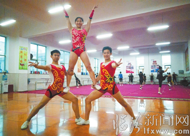 临汾新闻网讯 “跃起、踩肩、抛起,接着360°转体,再稳稳地落下……”11月15日,在临汾三中健美操队训练室里,伴随着激昂的音乐,该校健美操队队员胡展通、王梓宇和贺雨舒的三人操表演精彩上演,博得大家阵阵掌声和喝彩。