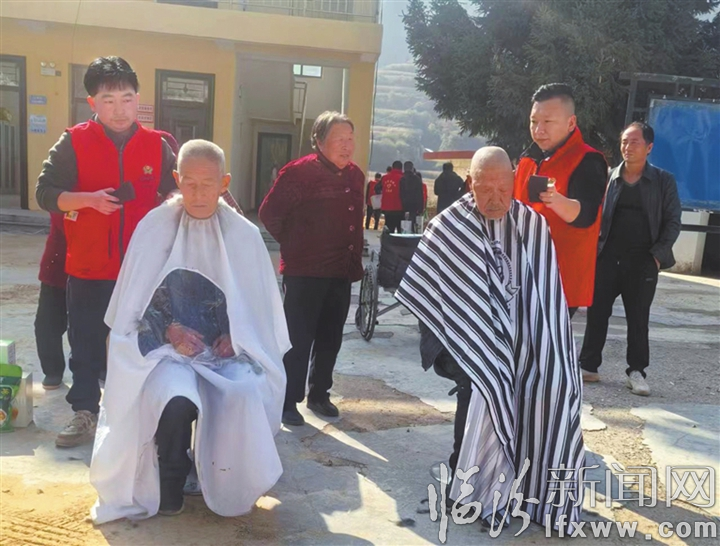 为关爱老年人,隰县农商银行近日组织志愿者走进隰县黄土镇上庄村,为行动不便的老人打扫房屋、清理环境卫生,并送上慰问品。图为志愿者为老人免费理发。