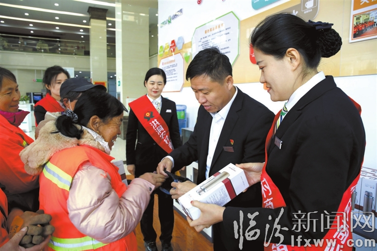 临汾新闻网讯 为深入践行社会责任,洪洞农商银行近日在城关支行爱心驿站开展户外劳动者关爱暨文明实践活动,用实实在在的举措传递农商银行温情,助力文明城市创建。图为工作人员向环卫工人赠送保暖用品和水杯。