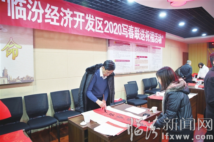 临汾新闻网讯 翰墨传情迎新春,赠写春联送祝福。连日来,临汾经济开发区开展写春联送祝福活动,活动现场,书法家们挥毫泼墨,用喜庆的对联将新春的美好祝福送给广大群众,让大家切实感受到书法的文化魅力和浓郁的节日气息。“天增岁月人增寿,春满乾坤福满楼”“迎新春前程似锦,庆佳节顺意平安”……一副副寓意吉祥的对联、风格不同的书法作品跃然纸上,有的春联墨迹未干就被大家欣喜地领走了,活动现场洋溢着喜庆的气氛。(梁青)