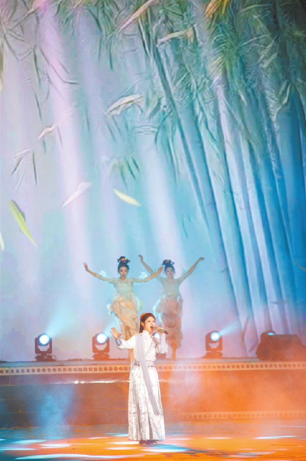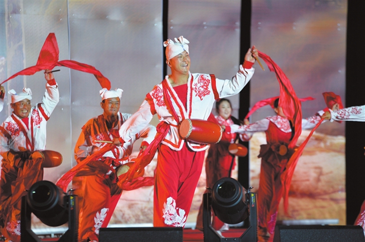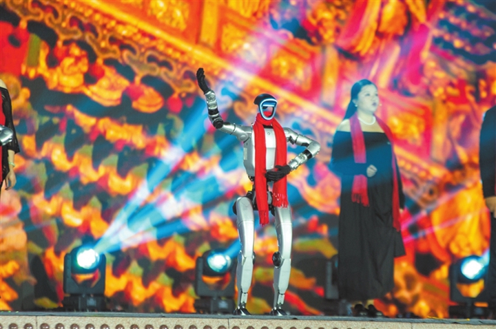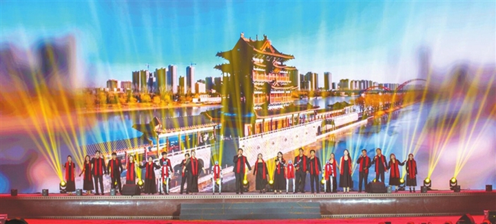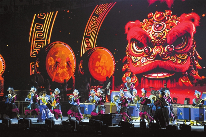 晚会在《鼓乐传响》激昂的旋律与优美的鼓乐声中正式拉开帷幕,从尧帝时期鼍鼓、平定迓鼓、绛州鼓乐、威风锣鼓到现代架子鼓的大型鼓乐表演,生动展现了中华礼乐文明的传承脉络与发展创新。随后,情景歌舞《春生》《秋获》先后以细腻的情节和飘逸灵动的舞姿展现了四季轮回中生命的孕育与收获过程,表达出对自然规律的敬畏和丰收的喜悦。地方传统戏剧《蒲剧选段》,作为国家非物质文化遗产之一,唱腔高亢激越且婉转俏丽,音韵独特,通过声腔传递情感,深受现场广大戏迷朋友的喜爱。人机合唱《对望》震撼全场,该节目大胆引入人工智能技术,象征传统与现代、科技与人文的和合共生,展现文明传承的创新表达。演出尾声,《相约临汾》旋律响起,全场观众起身合唱,歌声与笑声汇成温暖海洋。