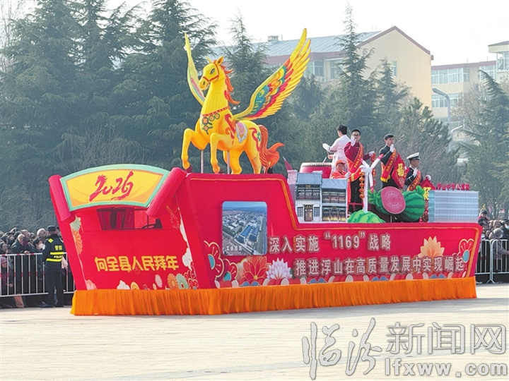 展演伊始,带有“建设一地一区一城一基地 倾力打造福寿之地 康养之城 美食之都”字样的彩车以灵动的造型勾勒出浮山新貌,紧随其后的舞蹈《骏马踏春来》以激昂的旋律拉开了整场展演的序幕,演职人员舞出了浮山人昂扬向上的精神风貌,更舞出了对美好生活的期盼和向往。