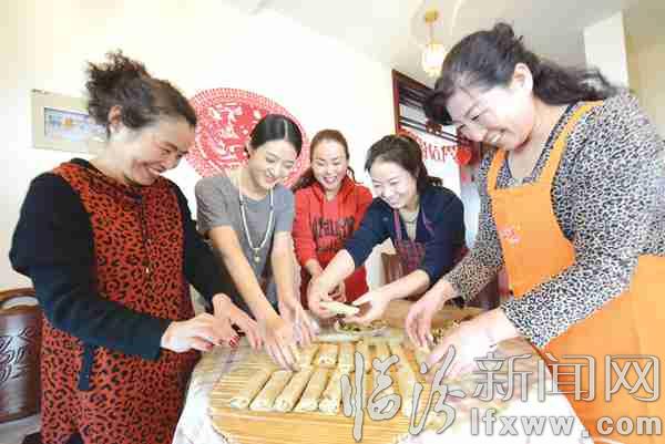 临汾新闻网讯 晋南的年俗,在正月二十要吃春卷。春卷就是将各色炒菜,如菠菜、韭菜、豆芽菜、粉丝、鸡蛋等,用面皮卷在一起,油煎着吃,非常可口。在本地有“吃了春卷,就算过完了年”的说法。图为开发区北孝村口嘉润豪庭小区的崔爱兰和家人一起做春卷。