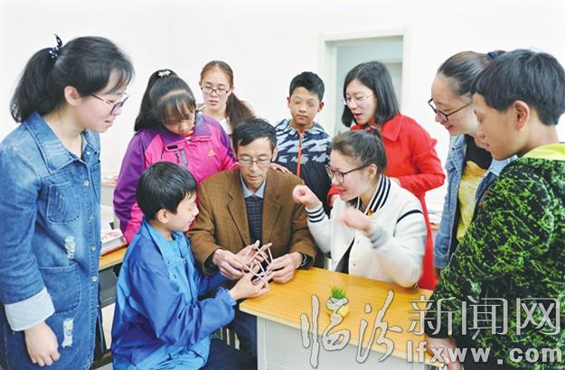 临汾新闻网讯 4月8日,青年志愿者在和临汾红丝带学校校长郭小平及孩子们一起做“翻花绳”游戏。当日,山西师范大学外国语学院“情系红丝带,每周一课”周末英语课堂开讲,该院11名优秀青年志愿者在每个周末来到红丝带学校,以英语情景剧、学唱英语歌等趣味教学方式,培养孩子们英语学习兴趣。