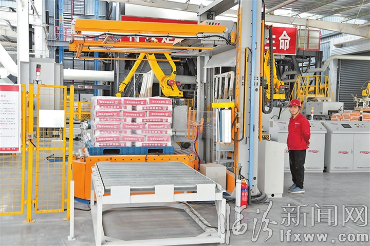 图为该公司工作人员操作机械设备对生产出来的新型绿色建筑材料进行打包。