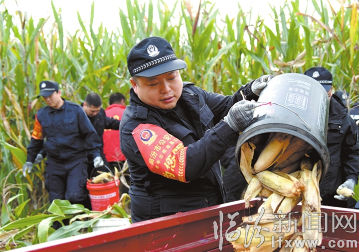 左图:10月14日,在襄汾县西贾乡南李村,市公安局的青年志愿者在帮助村民抢收玉米。