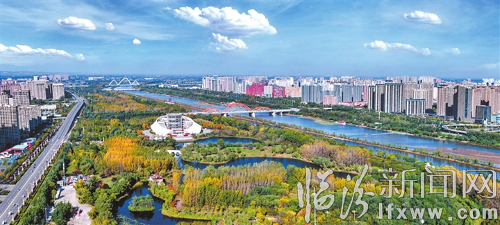 临汾新闻网讯 深秋时节,汾河文化生态景区层林尽染,整个公园变得色彩斑斓,与城市交相辉映,共同构成一幅色彩浓郁、诗意盎然的生态画卷。图为10月31日拍摄的汾河两岸风景。