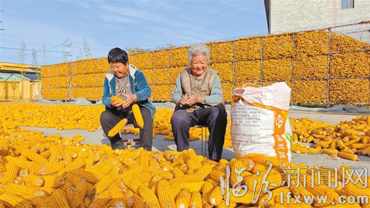 连日来,襄汾县新城镇玉米种植户抢抓晴好天气,对收获的玉米进行晾晒,确保秋粮颗粒归仓。图为11月9日,该镇闫店村村民晾晒玉米。