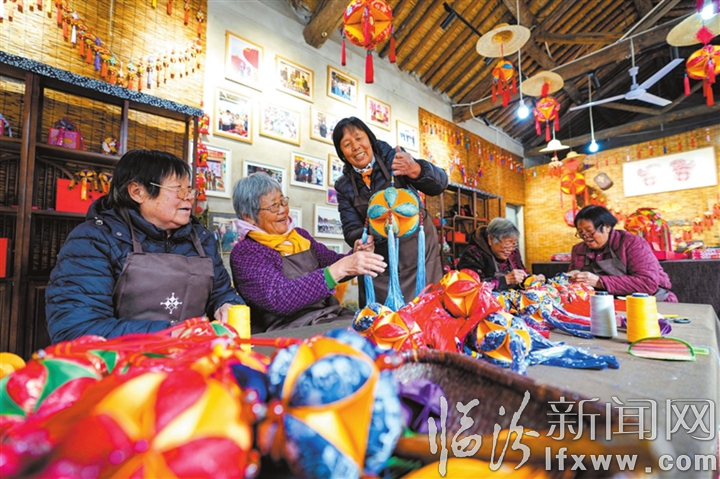临汾新闻网讯 冬日农闲时节,襄汾县赵康镇赵康村红红传统手工专业合作社里却是一片繁忙,妇女们正赶制一批太平绣球订单。该合作社自2016年成立以来,已带动60余名村民“家门口”就业,年均增收1万余元。图为11月22日,妇女们在飞针走线,制作太平绣球。