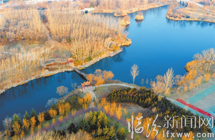 寒冬时节,市汾河文化生态景区林木尽染霜华,在阳光照耀下闪烁着迷人的光泽,与冰蓝的湖面交相辉映,呈现出一幅静谧而壮丽的生态美景。