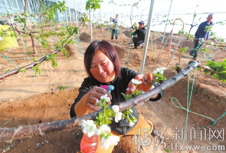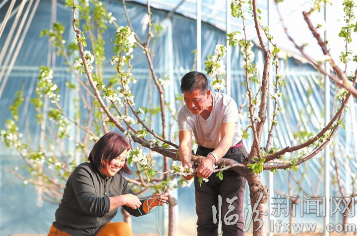 临汾新闻网讯 1月7日,在浮山县天坛镇东鲁村大棚樱桃种植基地,村民们在管护樱桃树。寒冬时节,南霍村大棚樱桃种植基地里,洁白如雪的樱桃花竞相绽放、清香扑鼻。村民们穿梭其间忙着对樱桃树修枝、压枝、授粉,进行一系列精细化管护工作,呈现出一幅幅生机盎然的喜人景象。