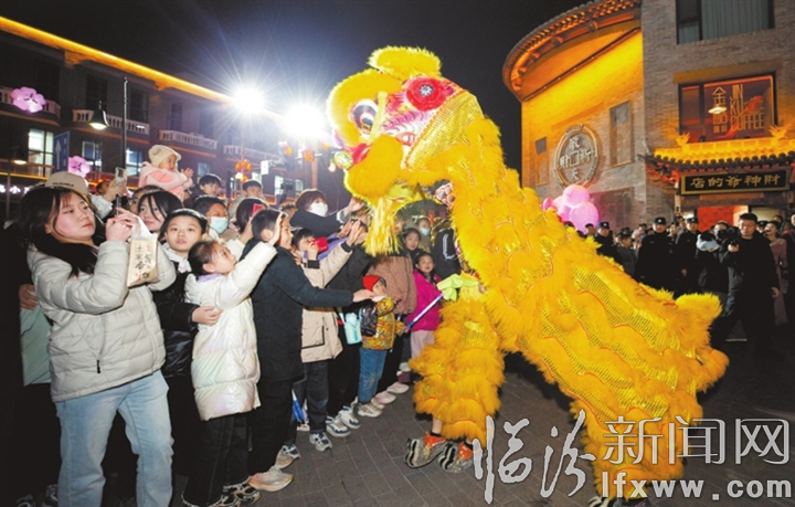 图② 财神楼街演出现场,锣鼓舞狮,暖意升腾。