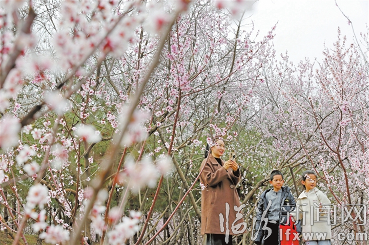 近日,市民在市汾河文化生态景区内欣赏竞相绽放的桃花。 王辉耀 摄