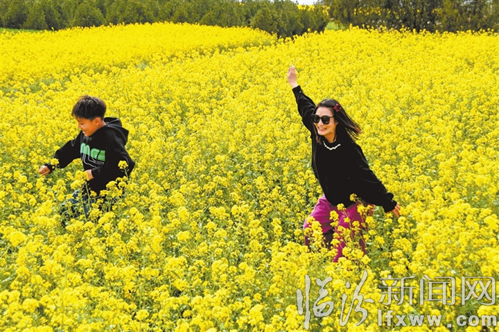 黄河一号旅游公路襄汾县丁村段供游客打卡的油菜花田满目金黄
