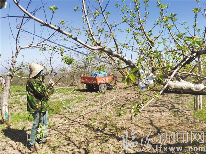 4月8日,大宁县太古镇坦达村果农抢抓农时,为苹果树喷施专用药剂,科学开展疏花保果作业,为苹果丰产丰收筑牢基础。