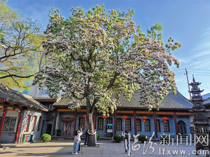 4月20日,临汾铁佛寺博物馆内,一株树龄约300年的古楸树迎来盛花期,满树繁花如云似雪,与古建相映成趣,游客纷纷驻足打卡,定格这跨越时光的春日盛景。