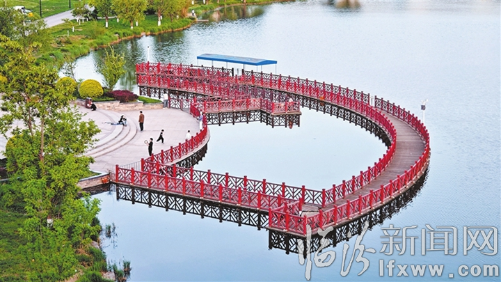 暮春时节,市区涝洰河生态公园栈道蜿蜒于河面,勾勒出灵动的曲线,岸边郁郁葱葱,桥上人影悠然,市民在这里尽享生态之美与生活之趣。