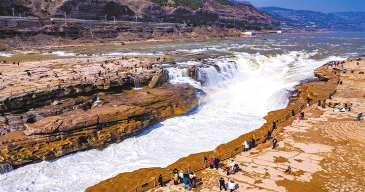 3月10日,游客在吉县壶口瀑布景区观瀑打卡。随着气温逐渐回升,黄河上游冰凌消融,壶口瀑布迎来了一...