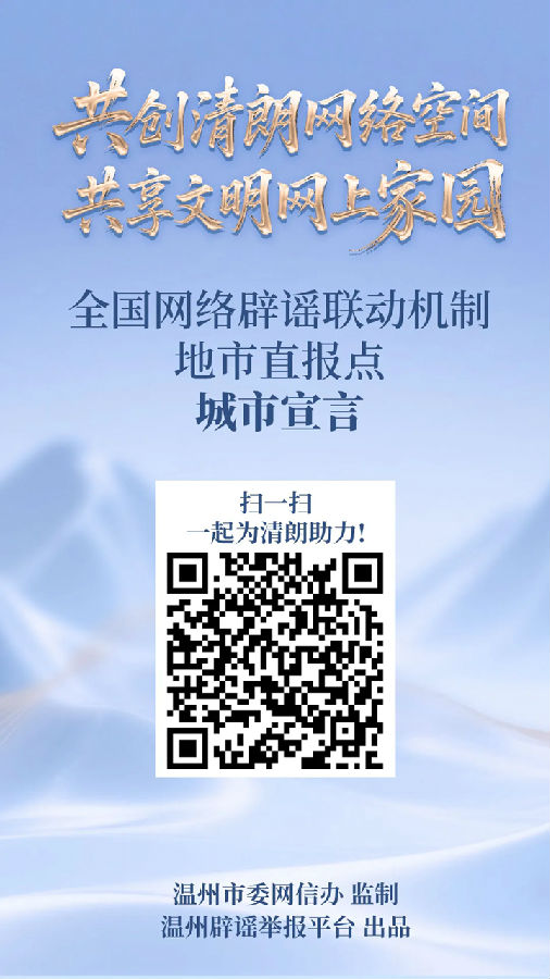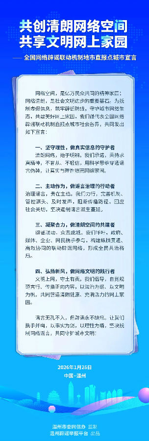 1月26日下午,以“深化辟谣联动 共建清朗网络”为主题的全国网络辟谣联动机制直报点建设现场推进会在浙江温州举办。会上,全国网络辟谣联动机制直报点共同发出《“共创清朗网络空间·共享文明网上家园”城市宣言》,号召社会各界坚守理性,做真实信息的守护者;主动作为,做谣言治理的行动者;凝聚合力,做清朗空间的共建者;弘扬新风,做网络文明的践行者,合力开拓更加健康、向上、美好的网络时代新未来