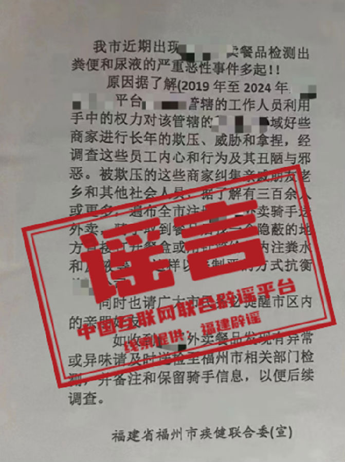 谣言:“福建省福州市疾健联合委”发文称“某外卖平台餐品检出粪便和尿液”?