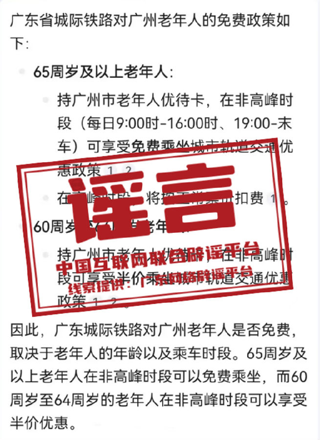 真相:近日,一张《广东省城际铁路对广州老年人的免费政策》截图在社交网络流传,其内容显示“广州老年人持优待卡在非高峰期搭广东城际可享受半价或免费优惠”,引发关注。对此,广东城际公司公开回应称:此消息不属实。按照《铁路旅客运输规程》规定,目前广东城际运营线路持中华人民共和国残疾军人证、中华人民共和国伤残人民警察证、国家综合性消防救援队伍残疾人员证的人员凭证以及学生凭学生证可以购买优待票,其中并不包括老年人优惠。另外,需要注意的是,如需购买相关优待票,目前只能使用12306票务系统办理。换言之,乘车码、羊城通等暂无优惠活动。(来源:“广东省互联网举报中心”微信公众号、“广州日报”微信公众号)